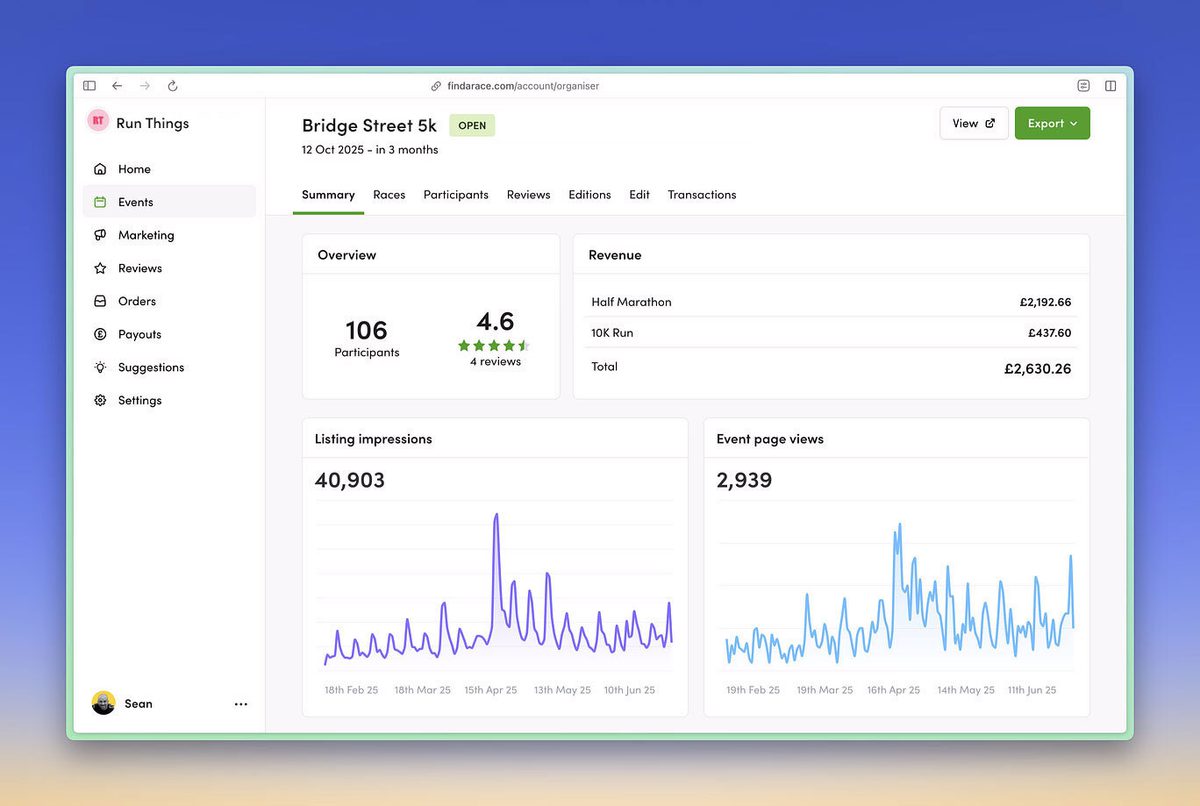 Our UK Race Organisers have an improved event summary screen that now includes more detailed revenue (breakdown of earnings per race), together with graphs showing how many times a race has been viewed in search results and the number of event page views.