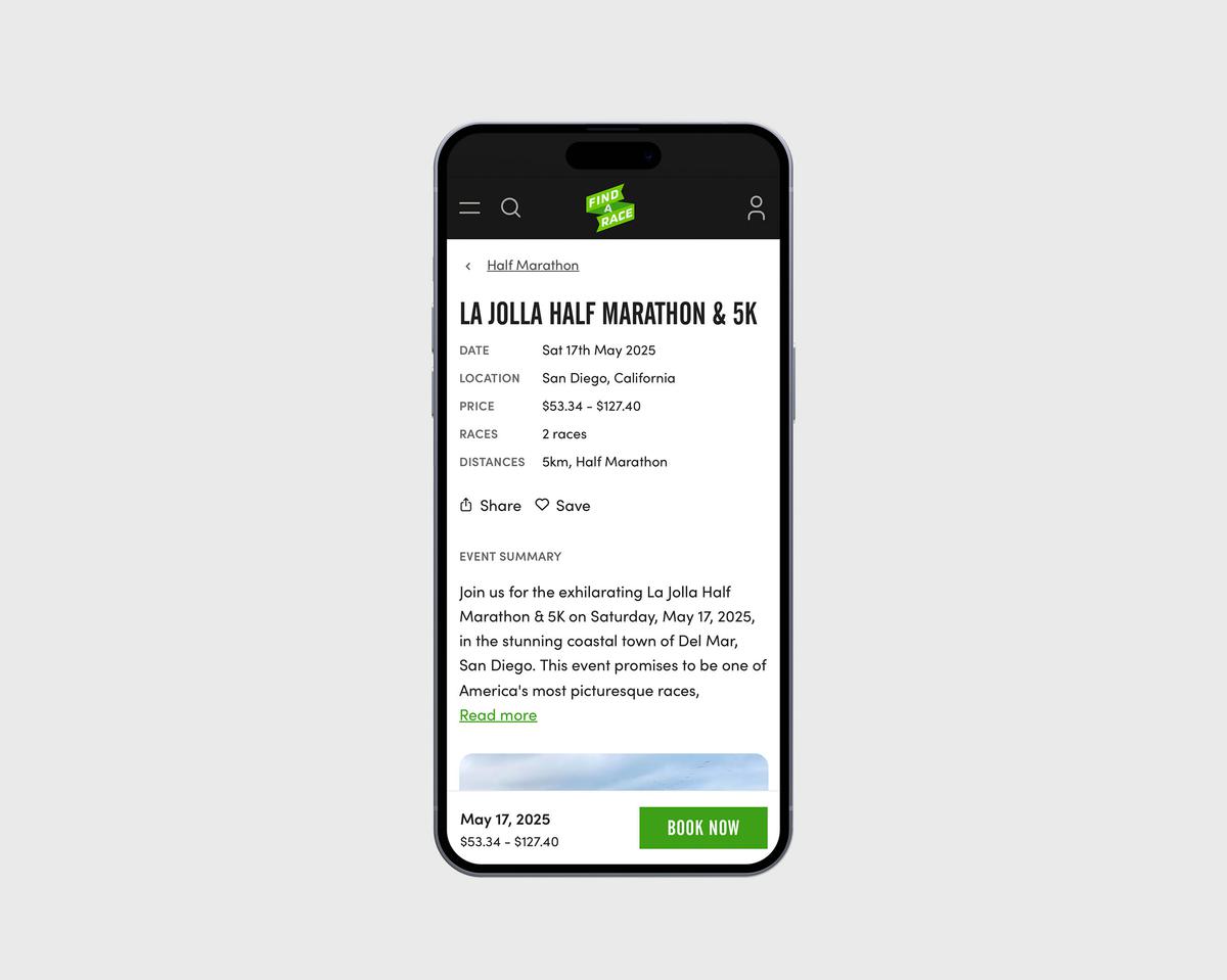 Users will end up on an event page, with an overview of the race, including date, location, map, price and distance. The focus of the page is the Book Now button, linking to the event website to find out more and hopefully book! That's the point at which we hand over to the Race Organizer, our marketing role complete.