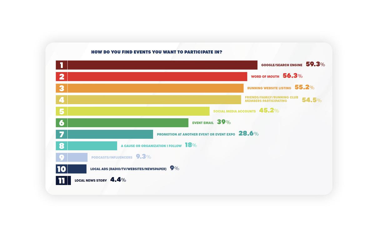 Running USA recently published its Global Runner Survey. Amongst other questions, this asked respondents how they found their next event. Perhaps unsurprisingly, the most common way to discover events is through online search. Second is word of mouth, third is listing sites.