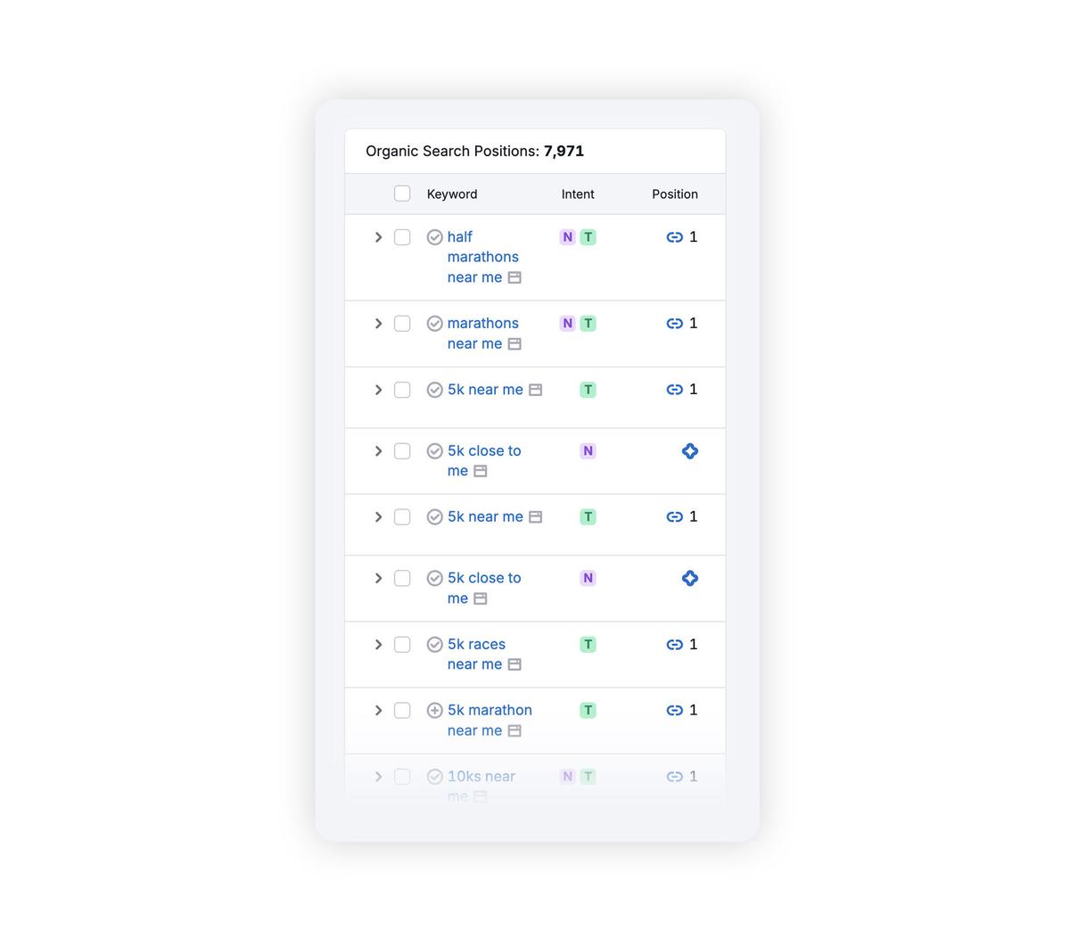 It's the non-branded searches where listings sites like findarace come in. Our users typically arrive on the site having done a generic keyword search, something like '10k near me', ' half marathon San Jose', '5k near me November' etc. We rank at #1 on Google for 1,000's of these generic keyword searches (below is a snapshot from our organic search performance tracking software).
